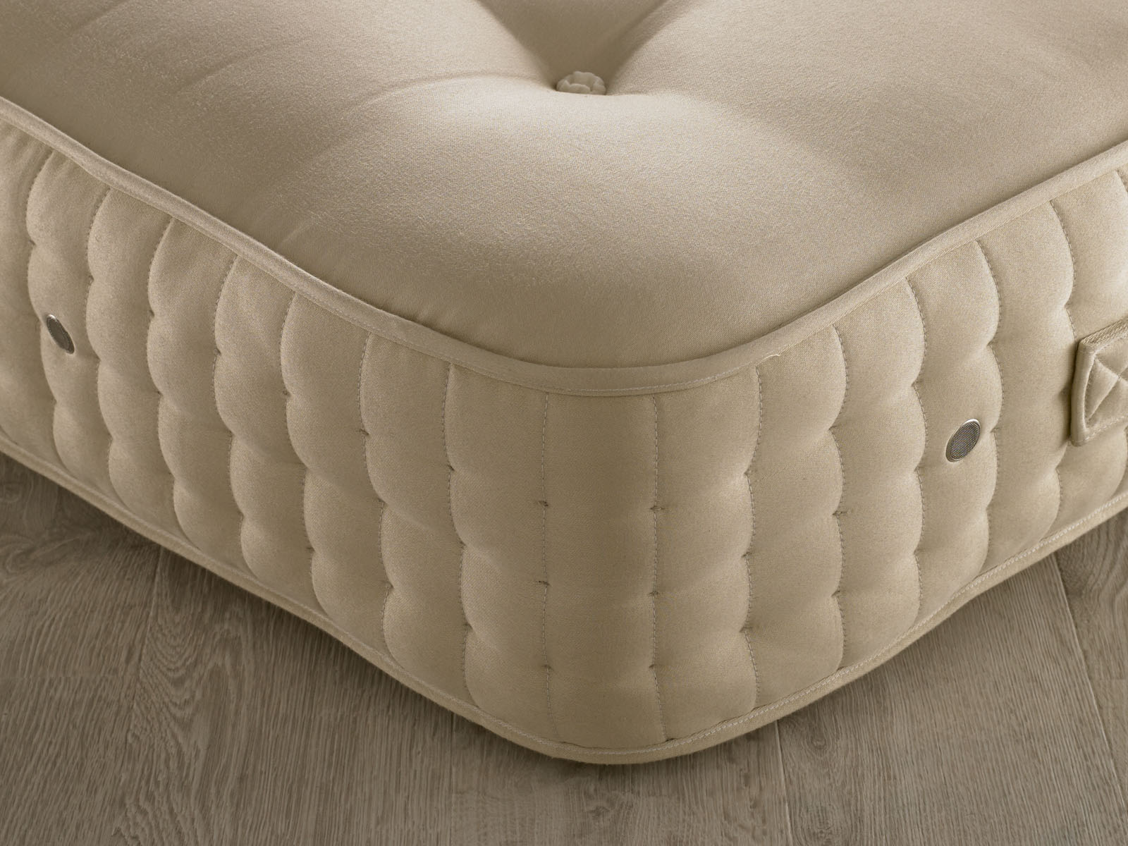 Eight horizontal handles on King Size and above. Air vents on all sides. Border edges upholstered with coir and lambswool.